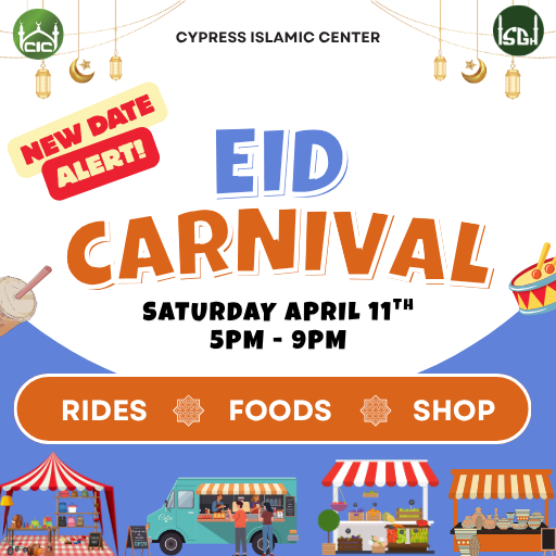 Cypress Islamic Center 16103 Cypress Rosehill Rd, CypressEid Mubarak! After a blessed Ramadan, it’s time to celebrate with your community. Come enjoy good food, fun games, and quality time with family and friends at the CIC Annual Eid Carnival. We can’t wait to see you there!